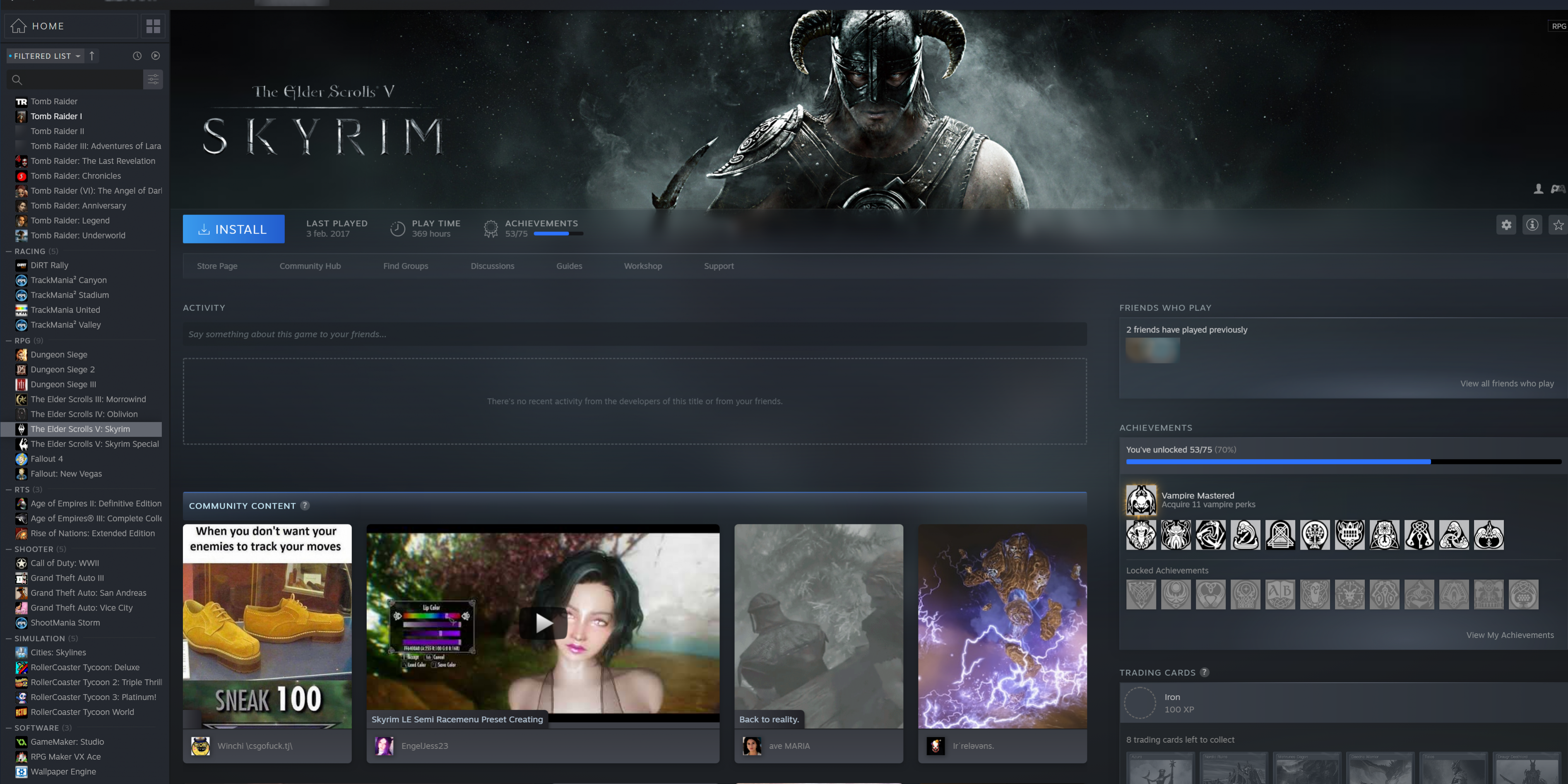 When you select a game you see a header with the logo of that game. Below that you see a play button and some info about when and how long you played this game. Below that you see the activity tab. When you earn an achievement it will be showed here. But if a friend earns achievements for that same game it will be showed as well. Bellow you have the community tab where you see screenshots and video’s from the community based on that game. To the right you find your friends that also played this game. And below that you will find your trade cards.